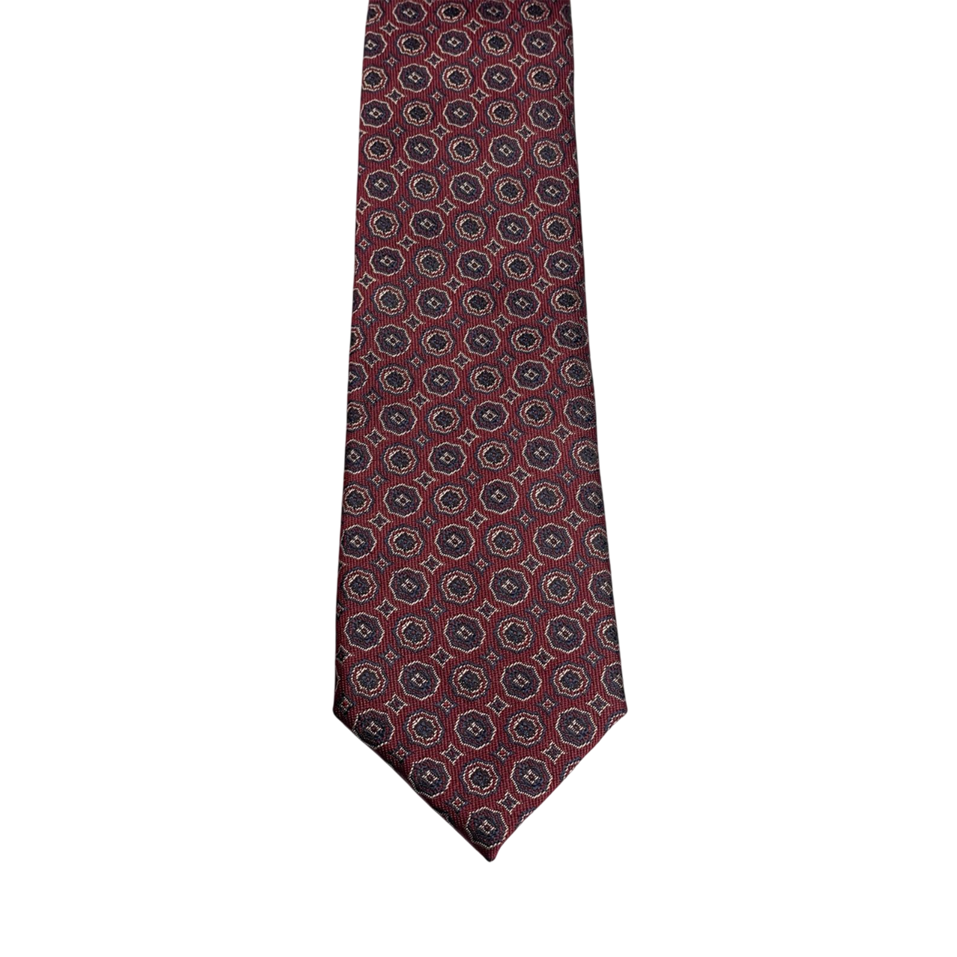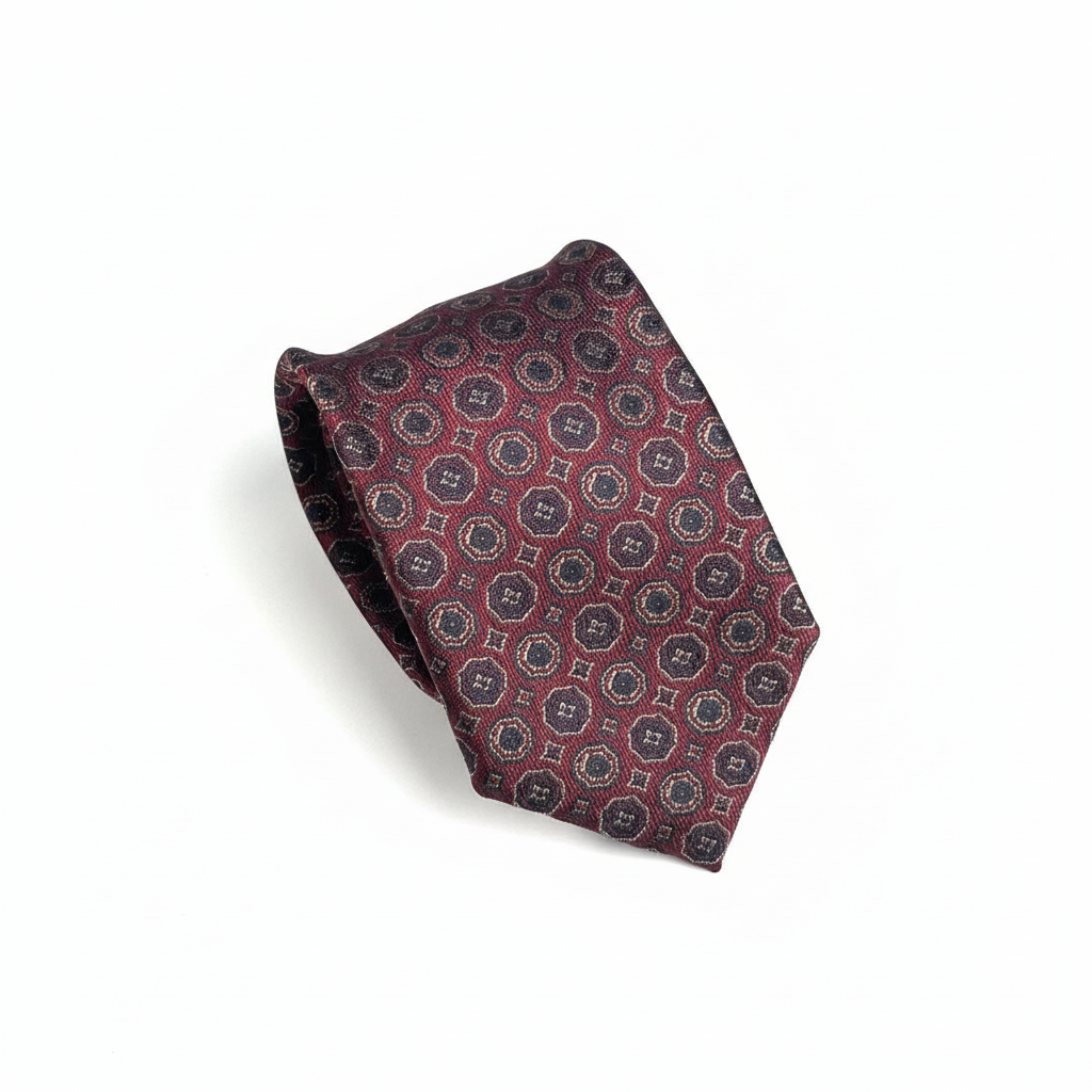 Crafted from premium silk, it has a smooth hand-feel and a subtle natural shine that photographs beautifully and sits clean under suit lapels. The rich burgundy tone is paired with a refined micro-medallion motif, making it easy to style with navy, charcoal, and black suits without looking loud. Whether it’s a business meeting, formal dinner, or a polished everyday outfit, this tie adds structure, elegance, and a confident finishing detail.